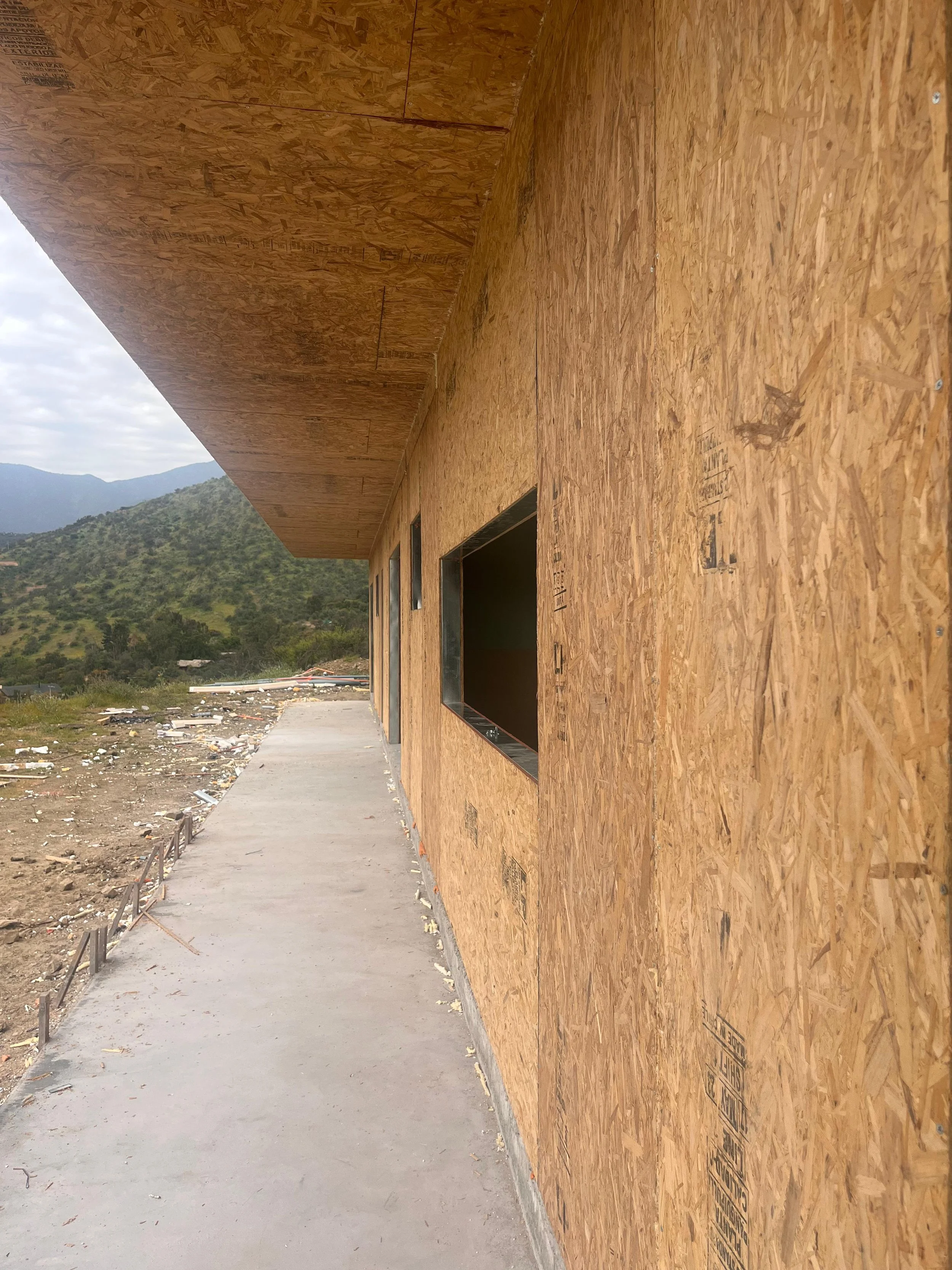 una casa construida con paneles de OSB de 11,4 mm para muros exteriores, paneles de yeso cartón de 9 mm para muros interiores y paneles de OSB de 18 mm para la cubierta. Este diseño prioriza la eficiencia estructural, la sostenibilidad y la resistencia, integrando materiales duraderos para un hogar moderno y funcional en un entorno natural.